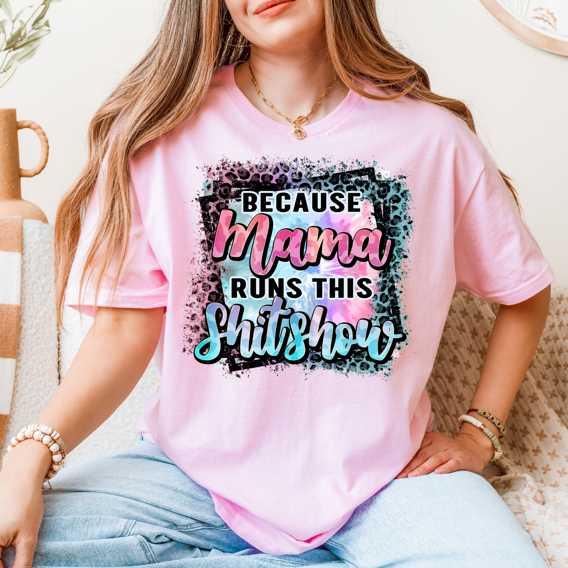 Add some sass to your mom wardrobe with this bold and hilarious "Because Mama Runs This Sh*tshow" T-shirt! Featuring a vibrant tie-dye background, edgy leopard print accents, and playful fonts in pink, blue, and black—this funny mom tee says exactly what you're thinking, loud and proud.