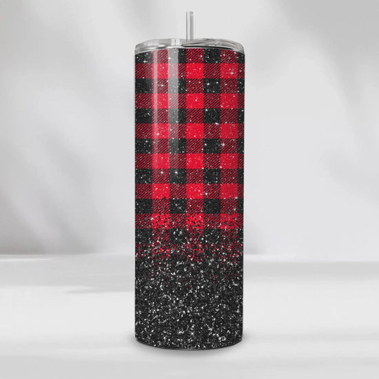 Christmas 20 oz Tumbler – Red Buffalo Plaid & Black Glitter with Personalized Name
