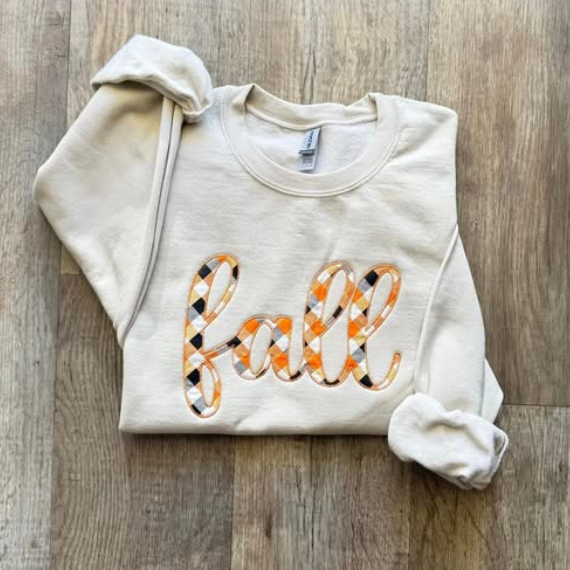 Celebrate sweater weather in style with our cozy Fall embroidered crewneck – the perfect staple for your autumn wardrobe. Featuring a bold script "fall" design with a festive orange, black, and cream plaid applique, this sweatshirt brings all the pumpkin spice energy you love! Crafted from a soft, premium cotton blend, this crewneck offers warmth, comfort, and a flattering unisex fit that’s perfect for hayrides, bonfires, or casual days out. Whether you're heading to the pumpkin patch or sipping cider at home, this embroidered sweatshirt makes the perfect seasonal statement.