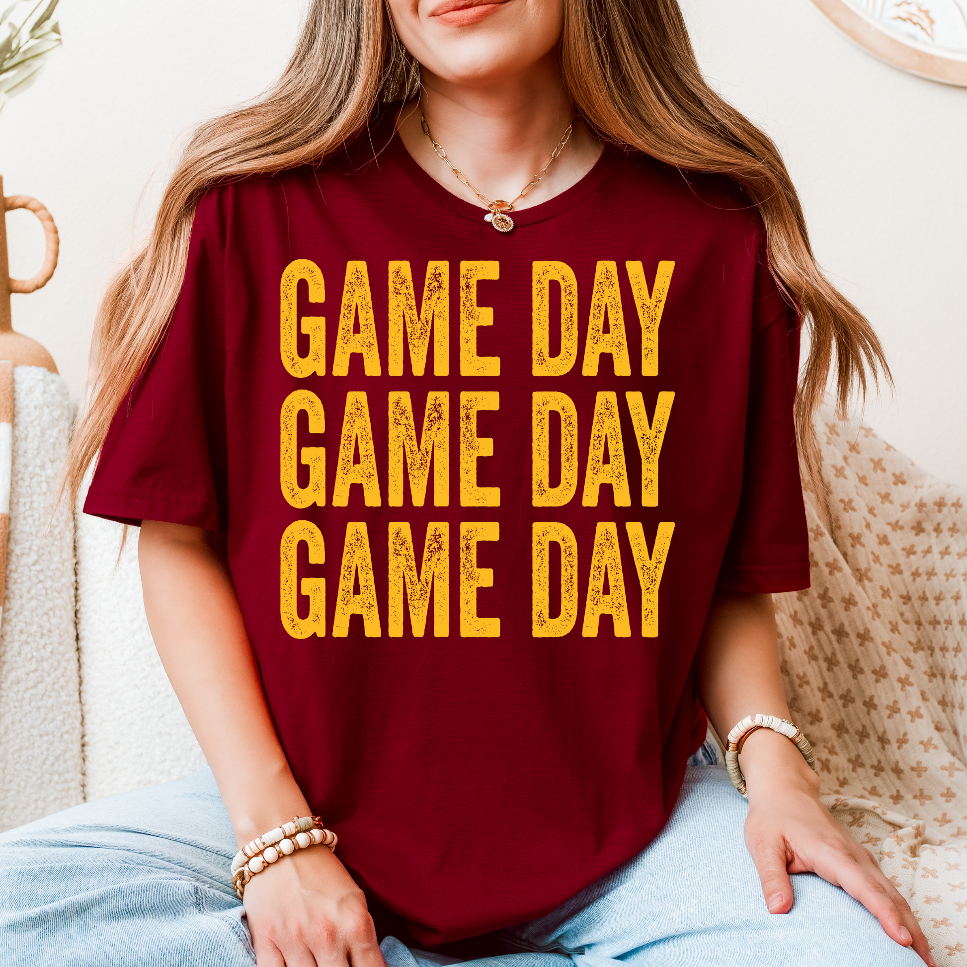 Show off your team spirit in style with our bold Game Day T-Shirt, perfect for Saturdays, Sundays, and every game day in between! Featuring a stacked “GAME DAY” design in vibrant, distressed lettering, this shirt is available in multiple color options to match your favorite college or NFL football team — whether you rep garnet & gold, red & black, orange & blue, or classic black & white.