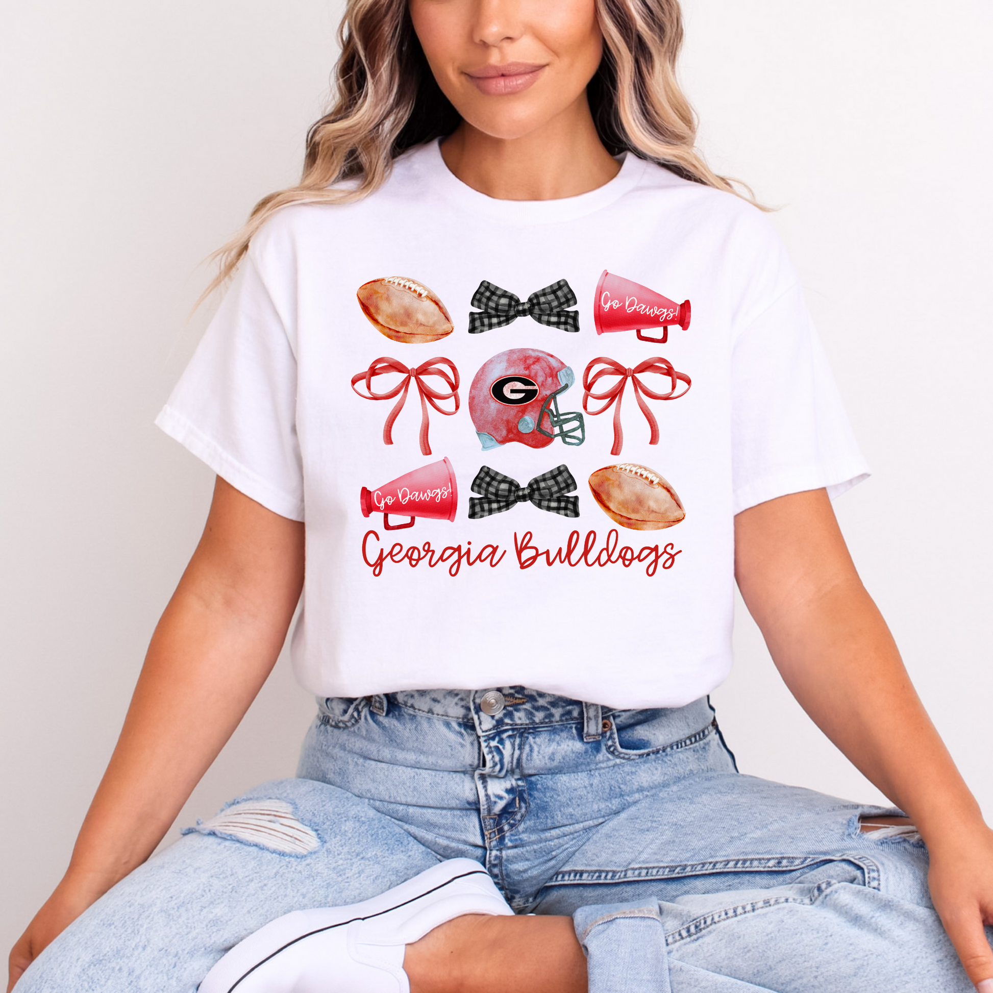 Show your team spirit in style with this Georgia Bulldogs Game Day T-Shirt, the perfect blend of southern charm and SEC pride. Featuring a watercolor-style football helmet, gingham bows, megaphones, and footballs, this fun and feminine UGA fan shirt is made for cheering on the Dawgs in true game day fashion.