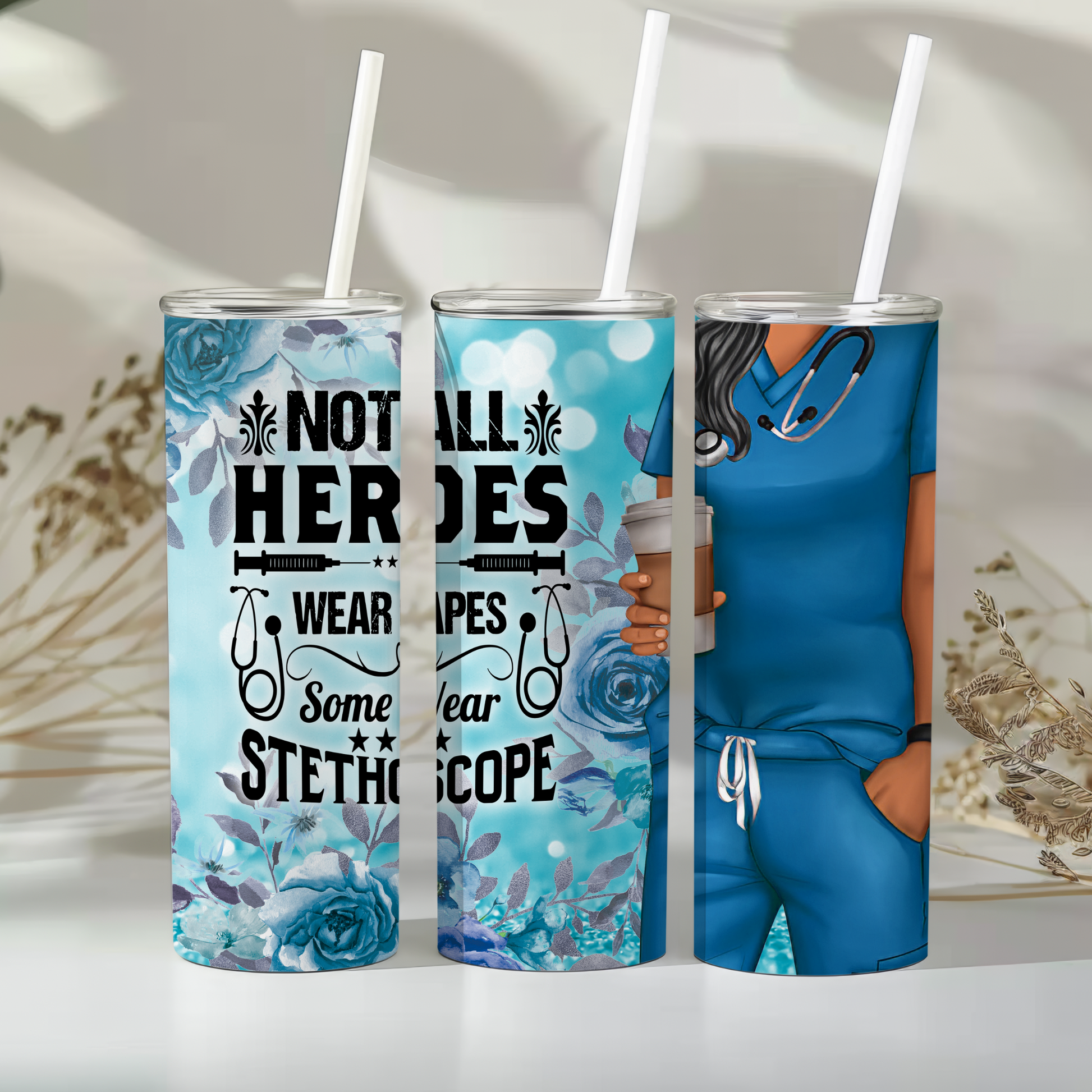 Honor the everyday heroes in scrubs with this Nurse 20 oz Tumbler, beautifully designed for the hardworking medical professionals who give it their all. Featuring a powerful quote—“Not All Heroes Wear Capes, Some Wear Stethoscopes”—alongside vibrant floral art and a stylish nurse illustration, this tumbler is the perfect blend of appreciation, function, and flair. Crafted from durable stainless steel with double-wall vacuum insulation, this insulated tumbler for nurses keeps drinks cold for up to 24 hours and hot for up to 12 hours