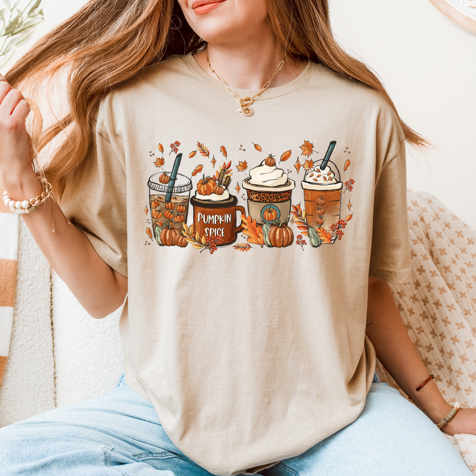 Spice up your fall wardrobe with our adorable Pumpkin Spice T-shirt, made just for those who live for sweater weather, falling leaves, and their daily dose of PSL! Featuring four festive coffee cups overflowing with whipped cream, pumpkins, and autumn details, this cute tee is a must-have for every pumpkin spice fan.
