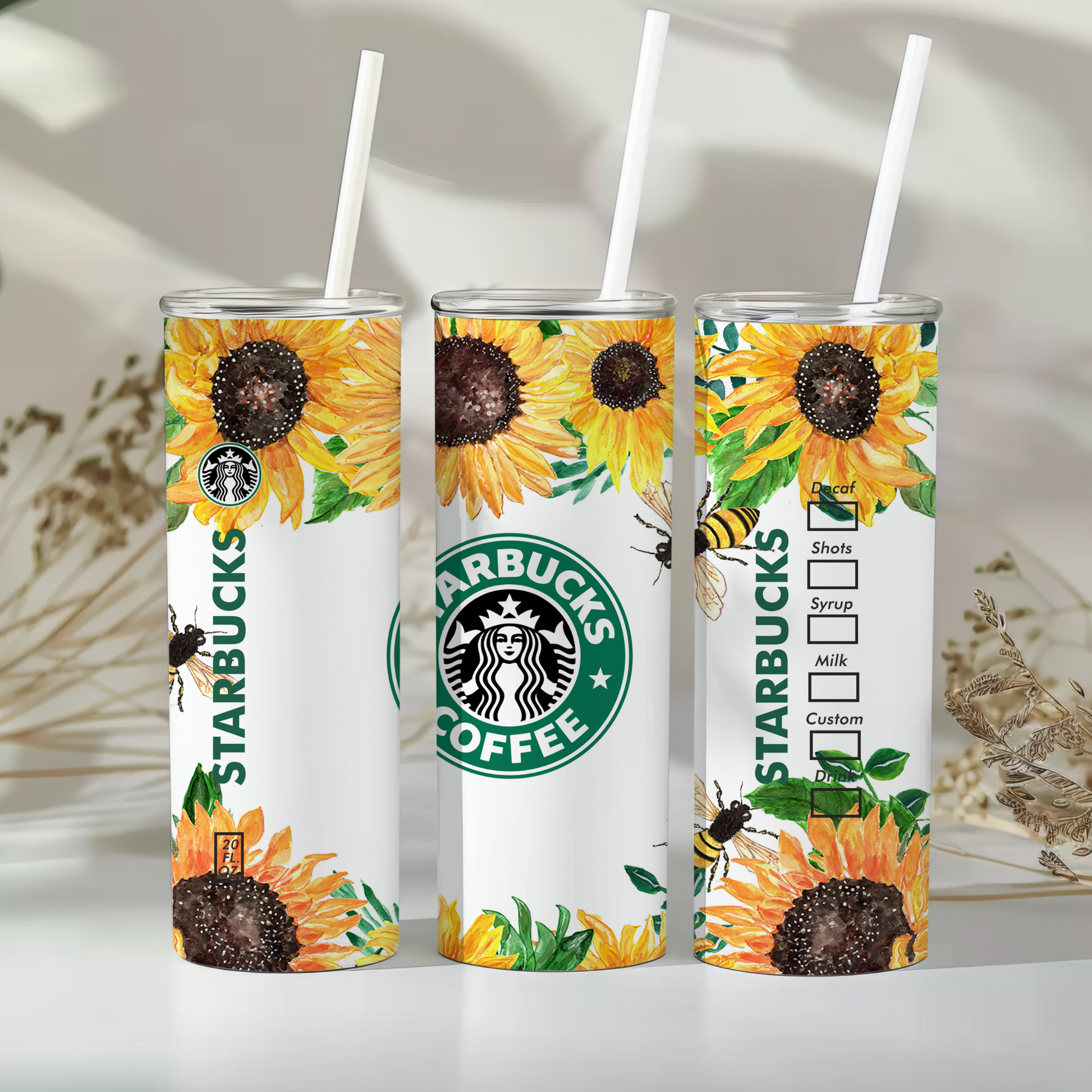 Fuel your day with sunshine and style! This Sunflower & Bee 20 oz Skinny Tumbler features a bright floral design inspired by summer blooms and buzzing bees, paired with a classic Starbucks-style layout—including the drink customization checklist and iconic branding look. With its cheerful sunflower motif and high-quality print, this tumbler is a must-have for coffee lovers, barista fans, and iced drink enthusiasts.